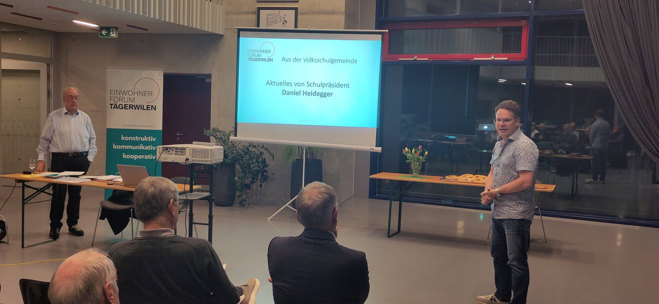 Jörg Schweizer gewährte uns einen exklusiven Einblick in seine faszinierende Veteranen-Sammlung mit Maschinen und Geräten aus der Land- und Forstwirtschaft der letzten hundert Jahre. In der sehr vollen Sägestube stellten sich die Kandidierenden für die VSG (Nadia Jaag und Mirko Spada) vor. Der vom Forum vorgeschlagene Kandidat Mirko Spada machte dann auch das Rennen. Die Präsidenten der politischen Gemeinde und der VSG informierten über Aktuelles aus ihren Körperschaften. «Pessimisten küsst man nicht – der positive Umgang mit sich und den Mitmenschen» war der Titel des interaktiven Auftritts von Karl-Ludwig Oehler. Er zog rasch den ganzen Saal in seinen Bann und es ergaben sich während und nach dem Vortag gute Diskussionen.